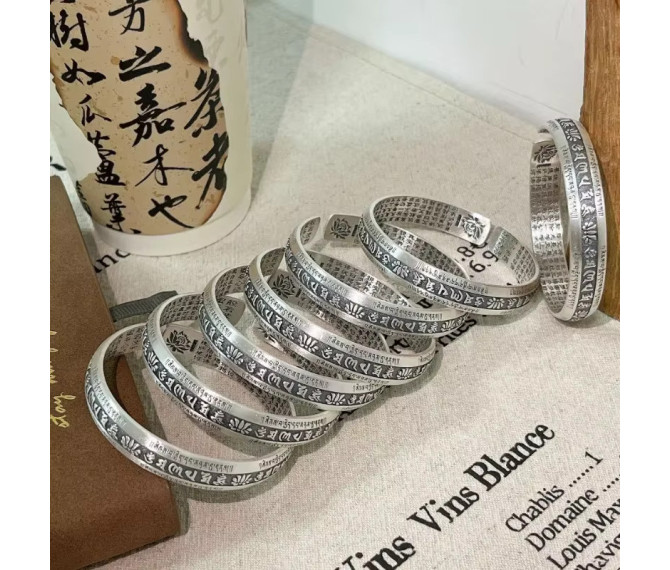 Carved Prajnaparamita Heart Sutra Lotus Flower Bracelet Silver Plated