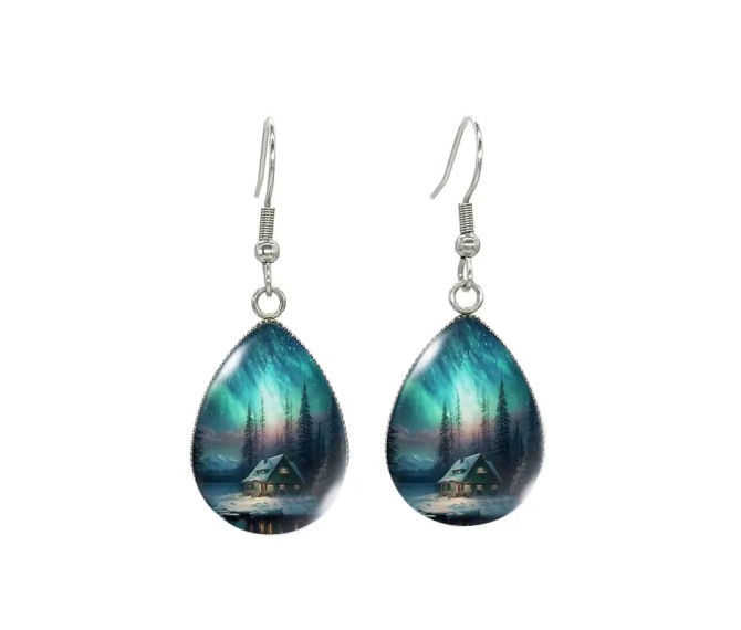 Aurora Borealis Cabin in the Woods Teardrop Earrings Fishhook