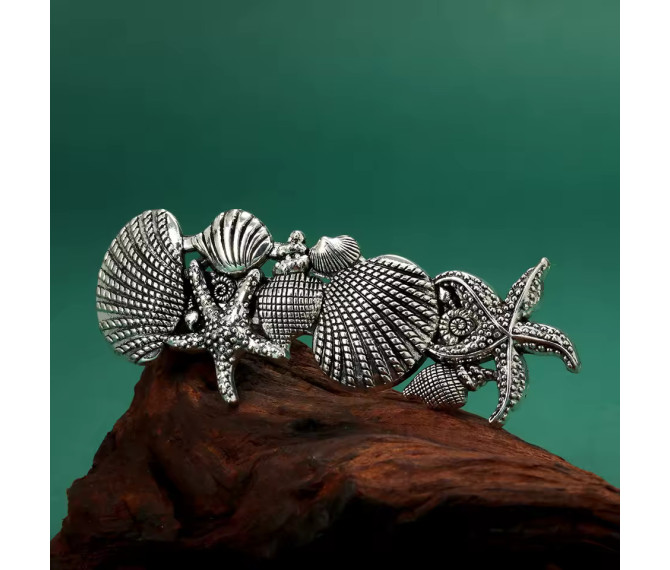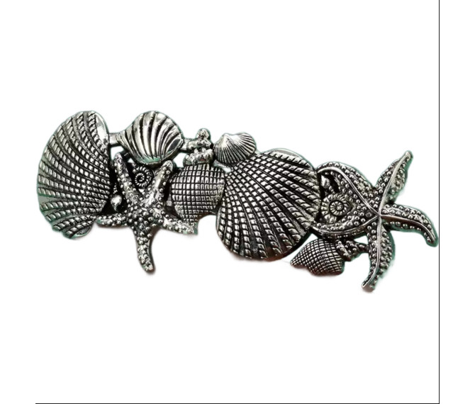 Bring a touch of seaside elegance to your hairstyle with this stunning vintage-style hair barrette. The beautifully detailed design features an array of seashells and starfish motifs crafted in an antique silver finish. This statement piece showcases intricate texturing on each shell, from delicate ridges to detailed cross-hatching, creating a sophisticated dimensional effect. The generous size makes it perfect for securing medium to thick hair, while the classic nautical theme adds a timeless charm to any outfit. Whether you're dressing up for a special occasion or adding a whimsical touch to your everyday look, this hair accessory combines both function and style. The sturdy construction ensures it stays securely in place while the ornate maritime elements make it an eye-catching addition to your hair accessories collection. Perfect for beach weddings, summer parties, or anyone who loves coastal-inspired fashion.