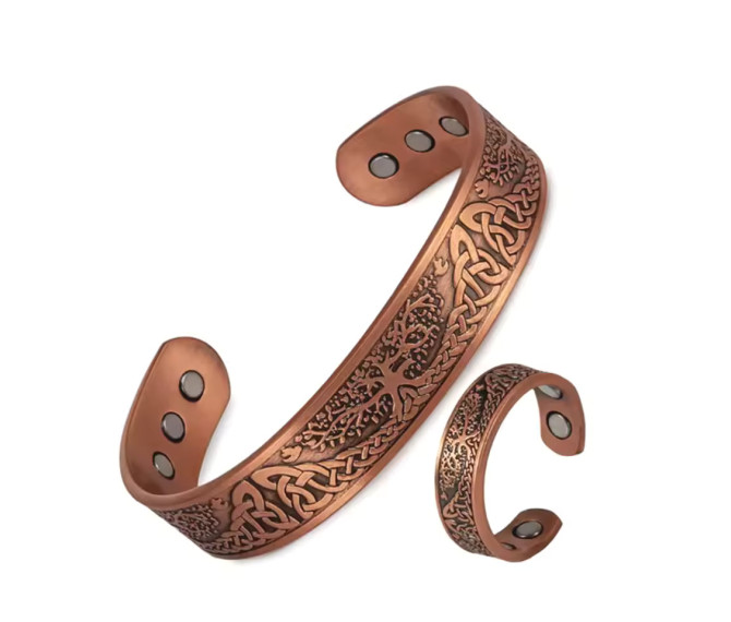 Pure Copper Celtic Tree Carved Cuff Bangle Bracelet and Ring Set, Adjustable With 6 Magnets 15-18cm