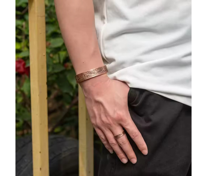 Elevate your style with this stunning Pure Copper Celtic Tree Carved Cuff Bangle Bracelet and Ring Set. Beautifully crafted from solid copper, this set features an intricate Celtic tree of life design with traditional knotwork patterns etched across the surface, giving it a timeless and mystical appeal. The cuff bracelet is adjustable to fit wrist sizes ranging from approximately 6 to 7 inches, making it a versatile fit for most adults. Each piece is embedded with powerful magnets — 6 in the bracelet and 2 in the ring — adding a therapeutic element to this eye-catching accessory. The warm antique copper finish adds depth and character to the detailed carvings, making this set a true conversation piece. Suitable for both men and women, this unisex set pairs effortlessly with casual and formal outfits alike. It also makes a thoughtful and unique gift for the holiday season. The set is water resistant, so you can wear it with confidence throughout your daily activities. Please note that the bracelet measures approximately 8.25 inches in length and 0.6 inches in thickness.